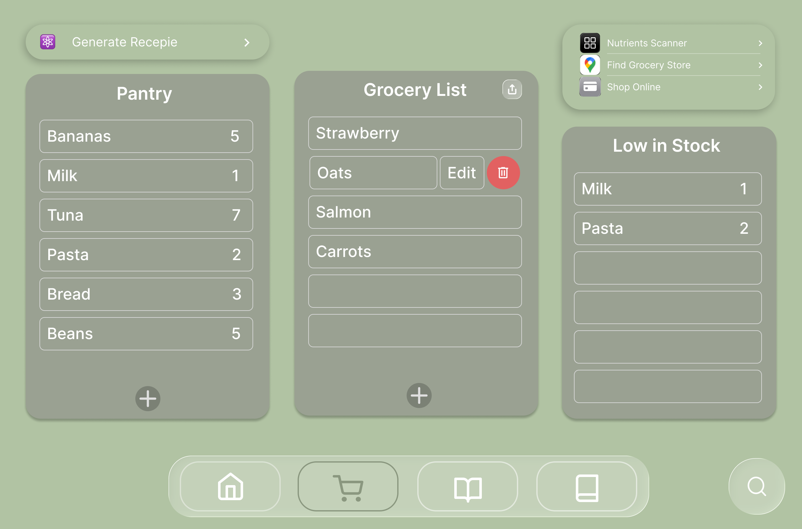Users can input pantry items, track low stock, and receive recipe suggestions based on current groceries. Integrated a barcode scanner to assess nutrition and suggest healthier alternatives.