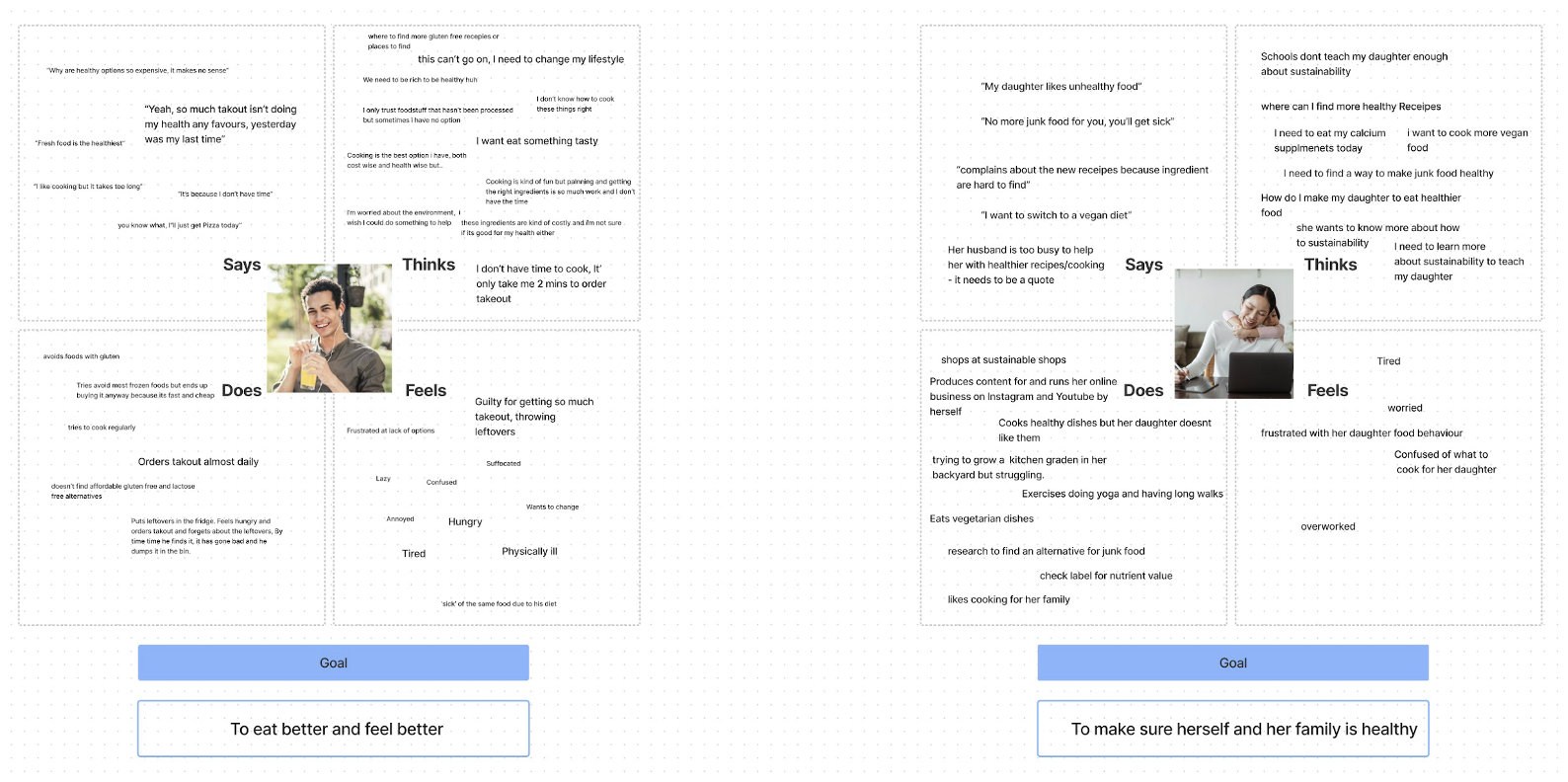 Organised pain points and opportunities into themes: meal planning challenges, sustainability awareness, and time constraints.